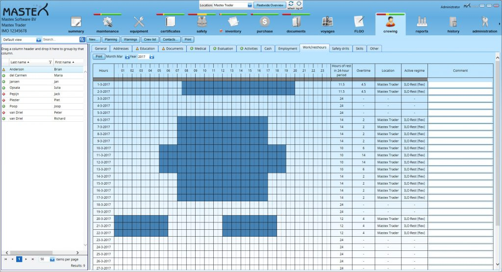 Of course the work and rest hours can be tracked and registered in Microsoft Excel. However, the administrative burden can be relieved markedly by registering these in the MXSuite Crewing module. One of the parts of the Crewing Module is the registration of work- and rest hours.