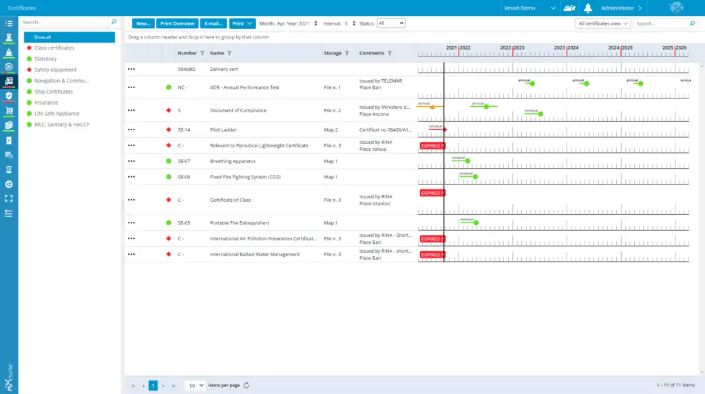 There are a large amount of certificates onboard of a ship . There could easily be over 50 different certificates on board. Every certificate has its own due date and several class societies are involved. In short: structure is important!