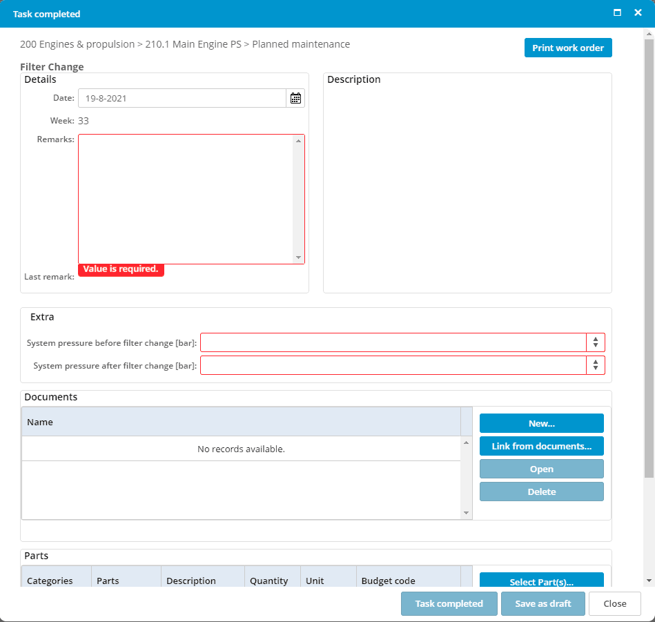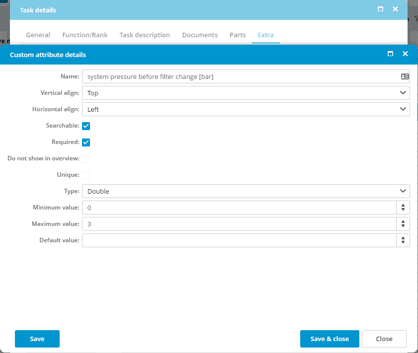 Lo que probablemente querrá es que el jefe de máquinas apunta la presión del sistema antes de cambiar el filtro. MXSuite le proporciona una forma única de personalizar las tareas agregando un atributo personalizado a una tarea.