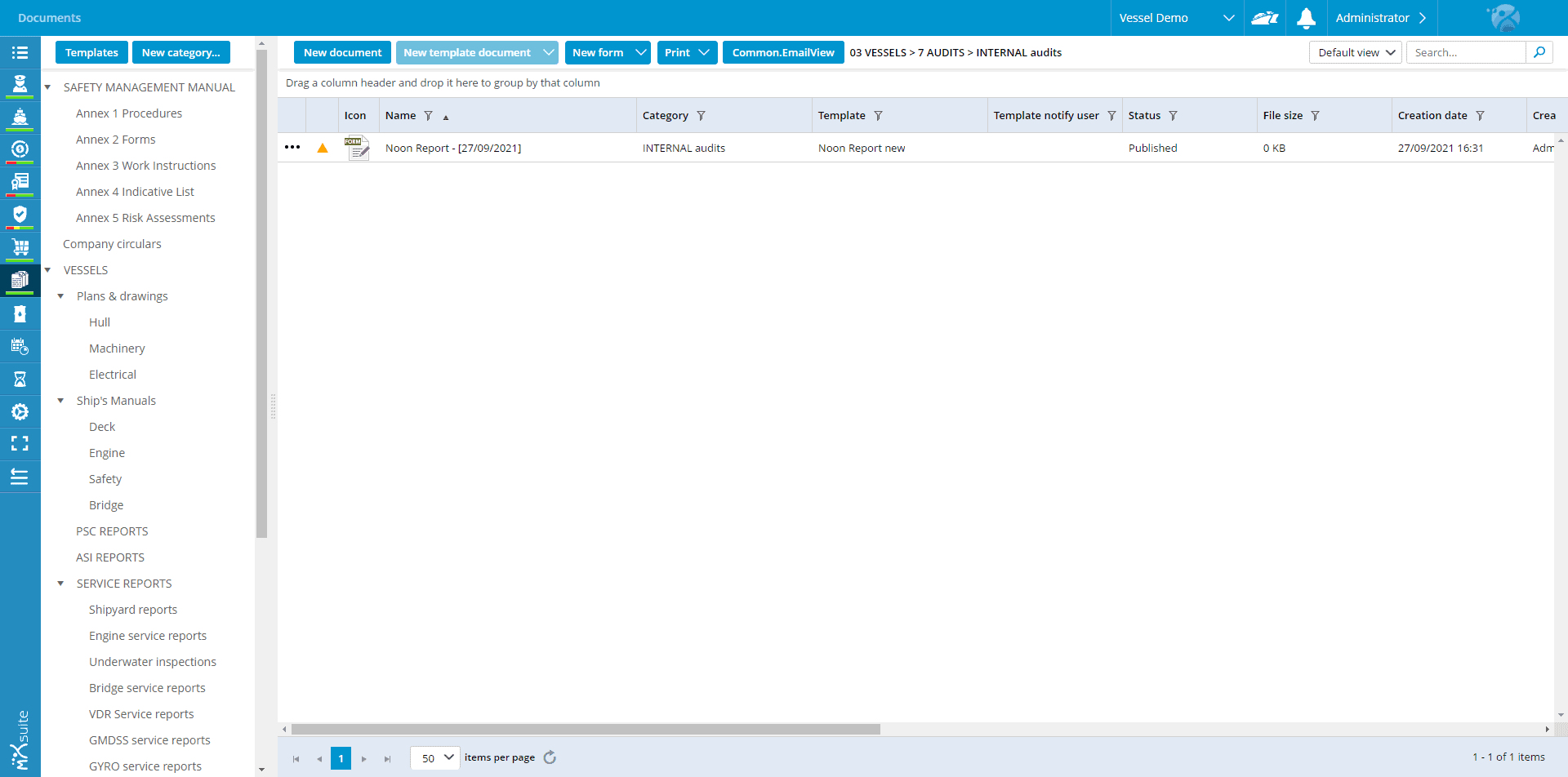Dans le module Documents de MXSuite, il est possible de créer des formulaires et des modèles. Vous pouvez déterminer qui est en mesure de les créer et où vous souhaitez enregistrer ces documents. Le module Documents garantit que tous les documents créés au bureau sont accessibles à bord par les membres d’équipage autorisés.