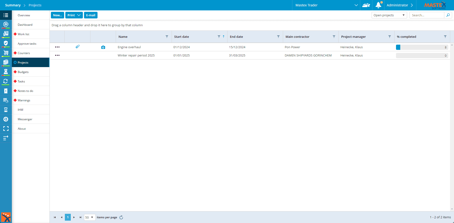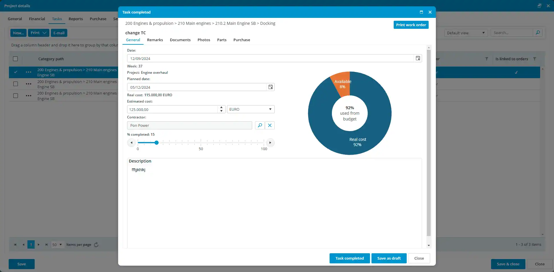 All project management tasks for planning, executing, and monitoring dry docks, refits, plus other engineering projects and repairs, can be performed in the Project module. To name a few: