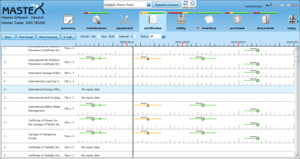 • Er kan een overzicht worden gemaakt van alle certificaten van de hele vloot. Zo kunnen bijvoorbeeld alle certificaten worden getoond die tussen nu en drie maanden vervallen. Of alle certificaten van DNV-GL of Lloyd’s Register zijn eenvoudig op te vragen.